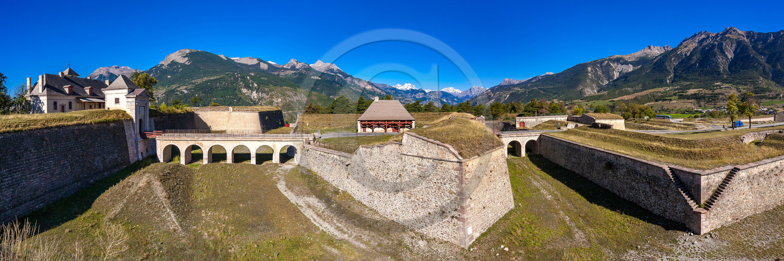 | Description | Hautes-Alpes (05), Guillestrois Queyras, vallée de la Durance, confluence du Guil et la Durance, Mont-Dauphin, village fortifié, la place forte de Mont-Dauphin construite par Vauban à partir de 1693 fait partie des 12 sites majeurs Vauban inscrits en 2008 au Patrimoine mondial de l'UNESCO, porte de Briançon et la demi-lune d'Anjou |