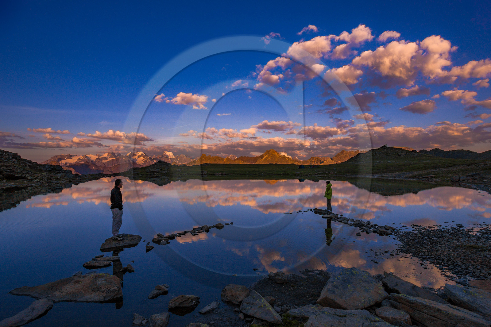 | Description | Hautes-Alpes (05), Briançonnais, Vallée de la Clarée, site naturel classé, Névache, randonnée pédestre et lever de soleil aux Lacs des Gardioles, au fond, le massif des Ecrins |