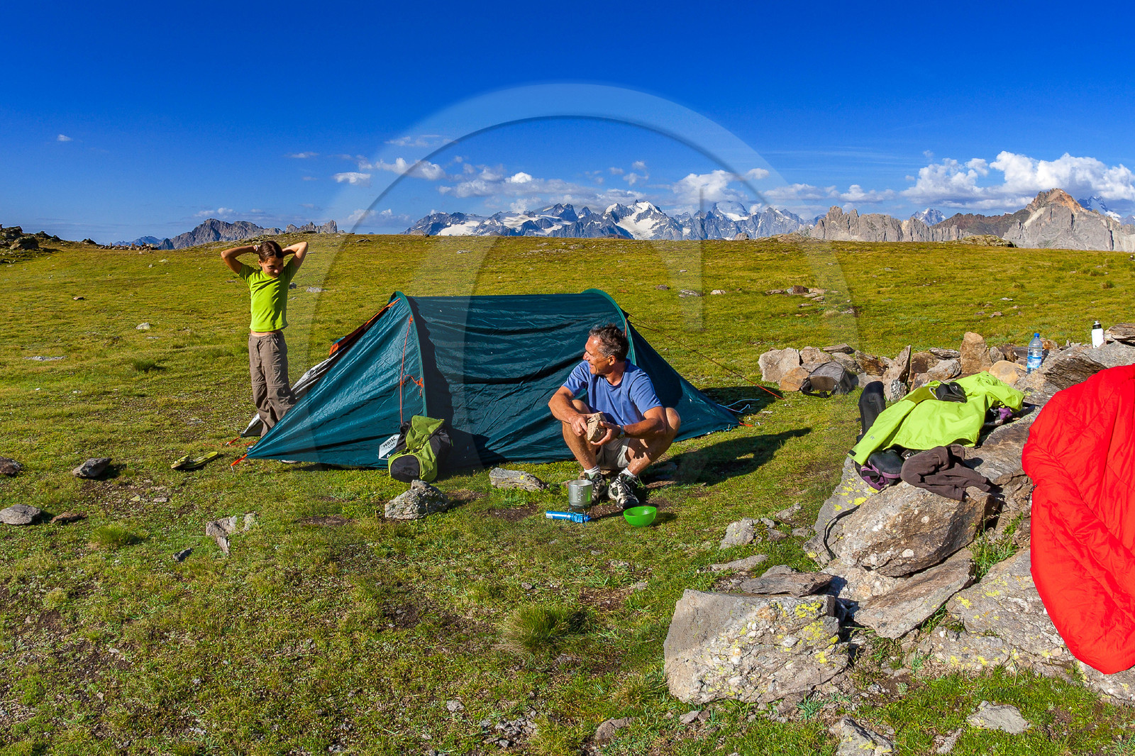 | Description | Hautes-Alpes (05), Briançonnais, Vallée de la Clarée, site naturel classé, Névache, Bivouac aux Lacs des Gardioles |