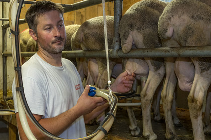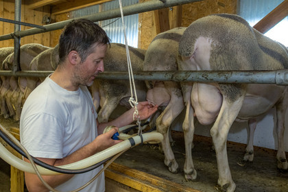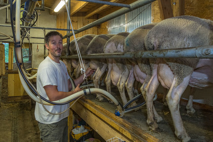 • Isère (38), massif de l'Oisans, vallée de la Lignarre, Parc national des Ecrins, Ornon, Bergerie de la Lignarre, Emilie Salvi et Jimmy Haussler, éleveurs de brebis laitières et producteurs de fromages frais et affinés, yaourts et fromages blancs et de viande d’agneau, traite des brebis laitière // Isère (38), Oisans massif, Lignarre valley, Ecrins national park, Ornon, Bergerie de la Lignarre, Emilie Salvi and Jimmy Haussler, dairy sheep breeders and producers of fresh and matured cheeses, yogurts, white cheeses and lamb meat
