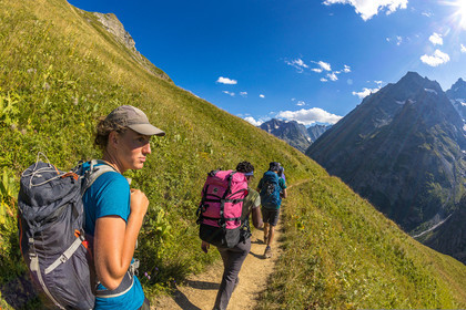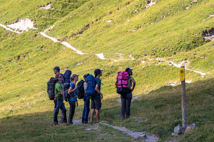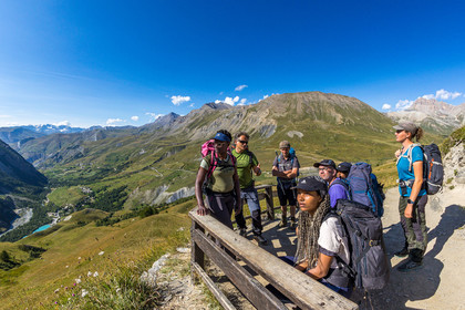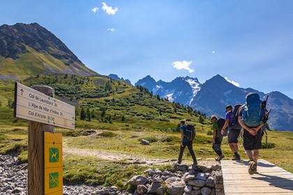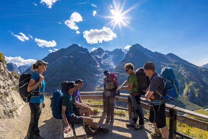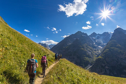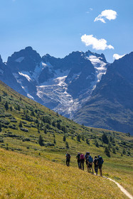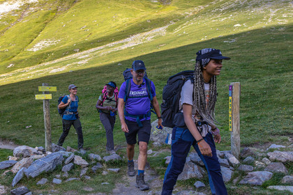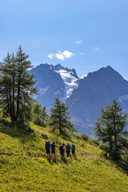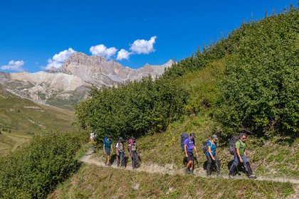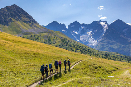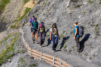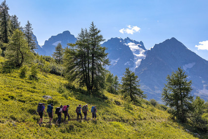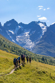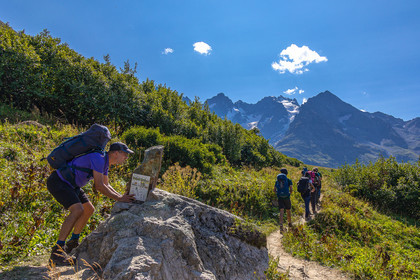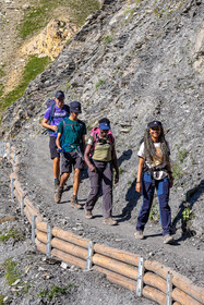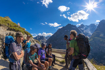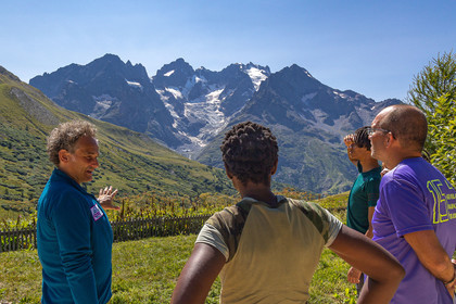• Hautes-Alpes (05), Parc national des Ecrins, Haute vallée de la Romanche, randonnée en itinérance avec Olivier Bello, accompagnateur en moyenne montagne, randonnée itinérante des 'Refuges Sentinelles', quand randonnée et plaisir des sciences se conjuguent, sur le sentier des crevasses // Hautes-Alpes (05), Ecrins National Park, Romanche valley, roaming hike with Olivier Bello, mid-mountain guide, itinerant hike of the 'Sentinel Refuges', when hiking and the pleasure of science combine