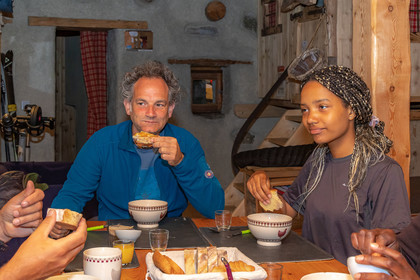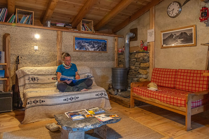 • Hautes-Alpes (05), Parc national des Ecrins, Haute vallée de la Romanche, randonnée en itinérance avec Olivier Bello, accompagnateur en moyenne montagne, randonnée itinérante des 'Refuges Sentinelles', quand randonnée et plaisir des sciences se conjuguent, Chalet Refuge de Chamoissière et Laétitia Genitoni, // Hautes-Alpes (05), Ecrins National Park, Romanche valley, roaming hike with Olivier Bello, mid-mountain guide, itinerant hike of the 'Sentinel Refuges', when hiking and the pleasure of science combine, Chalet Refuge of Chamoissière