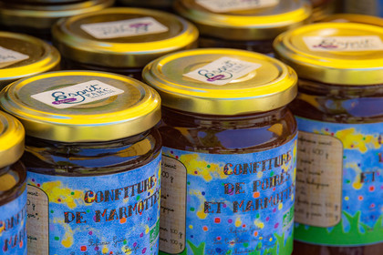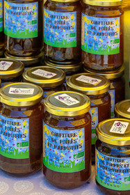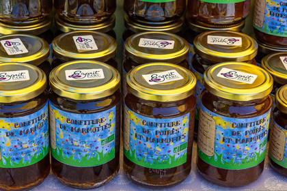 • Hautes-Alpes (05), Parc national des Ecrins, Le Monêtier-les-Bains, Le Lauzet, Les cueillettes du Lauzet, Stéphanie Gude propose des confitures et gelées de petits fruits, des mélanges de plantes séchées à utiliser en infusion ou en cuisine, ainsi que des brins de génépi blanc cultivé , confiture de marmotte // Hautes-Alpes (05), Ecrins National Park, Le Monêtier-les-Bains, Le Lauzet, Les cueillettes du Lauzet, Stéphanie Gude offers berry jams and jellies, mixtures of dried plants to use in infusion or in cooking , as well as strands of cultivated white genepi