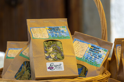 • Hautes-Alpes (05), Parc national des Ecrins, Le Monêtier-les-Bains, Le Lauzet, Les cueillettes du Lauzet, Stéphanie Gude propose des confitures et gelées de petits fruits, des mélanges de plantes séchées à utiliser en infusion ou en cuisine, ainsi que des brins de génépi blanc cultivé // Hautes-Alpes (05), Ecrins National Park, Le Monêtier-les-Bains, Le Lauzet, Les cueillettes du Lauzet, Stéphanie Gude offers berry jams and jellies, mixtures of dried plants to use in infusion or in cooking , as well as strands of cultivated white genepi