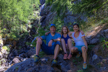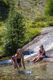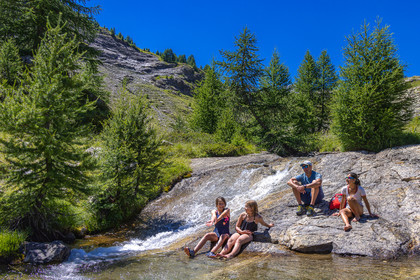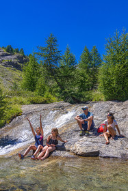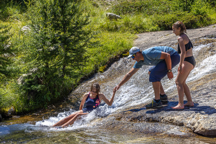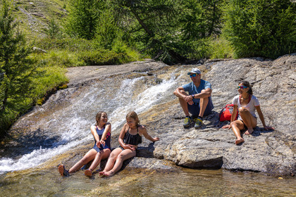 • Hautes-Alpes (05), Parc national des Ecrins, vallée de Freissinières, Alexandre Puech, accompagnateur en moyenne montagne, randonnée pédestre en famille, baignade dans le Torrent du Pont de Fer // Hautes-Alpes (05), Ecrins National Park, Freissinières Valley, Alexandre Puech, mid-mountain guide, family hiking, Torrent du Pont de Fer