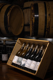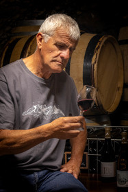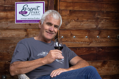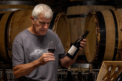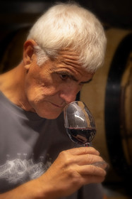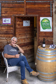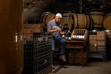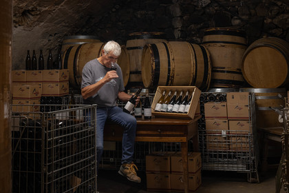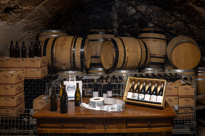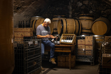 • Hautes-Alpes (05), Parc national des Ecrins, Pays de Serre-Ponçon, Embrun, Domaine du Mont Guillaume, Emmanuel Berteloot vigneron, dans la cave du domaine // Hautes-Alpes (05), Ecrins National Park, Pays de Serre-Ponçon, Embrun, Domaine du Mont Guillaume, Delphine and Emmanuel Berteloot winegrowers, mollard harvest, an endemic grape variety of the Hautes Alpes
