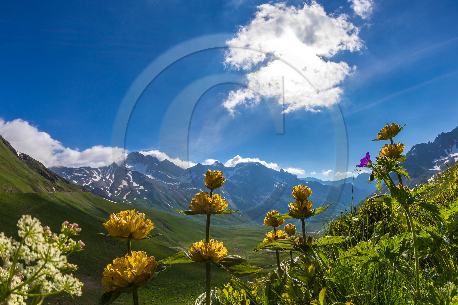 | Description | Hautes-Alpes (05), Parc national des Ecrins, Col du Lautaret, Gentiane ponctuée devant le Pic du Galibier |