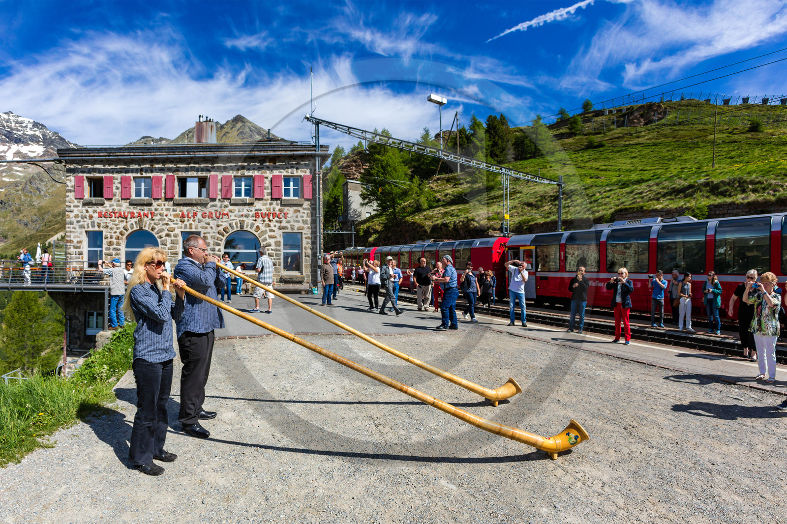 | Description | Suisse, canton des Grisons, Chemins de fer rhétiques, traversée des Alpes à bord du Bernina Express, itinéraire inscrit au patrimoine mondial de l'UNESCO, Alp Grüm |