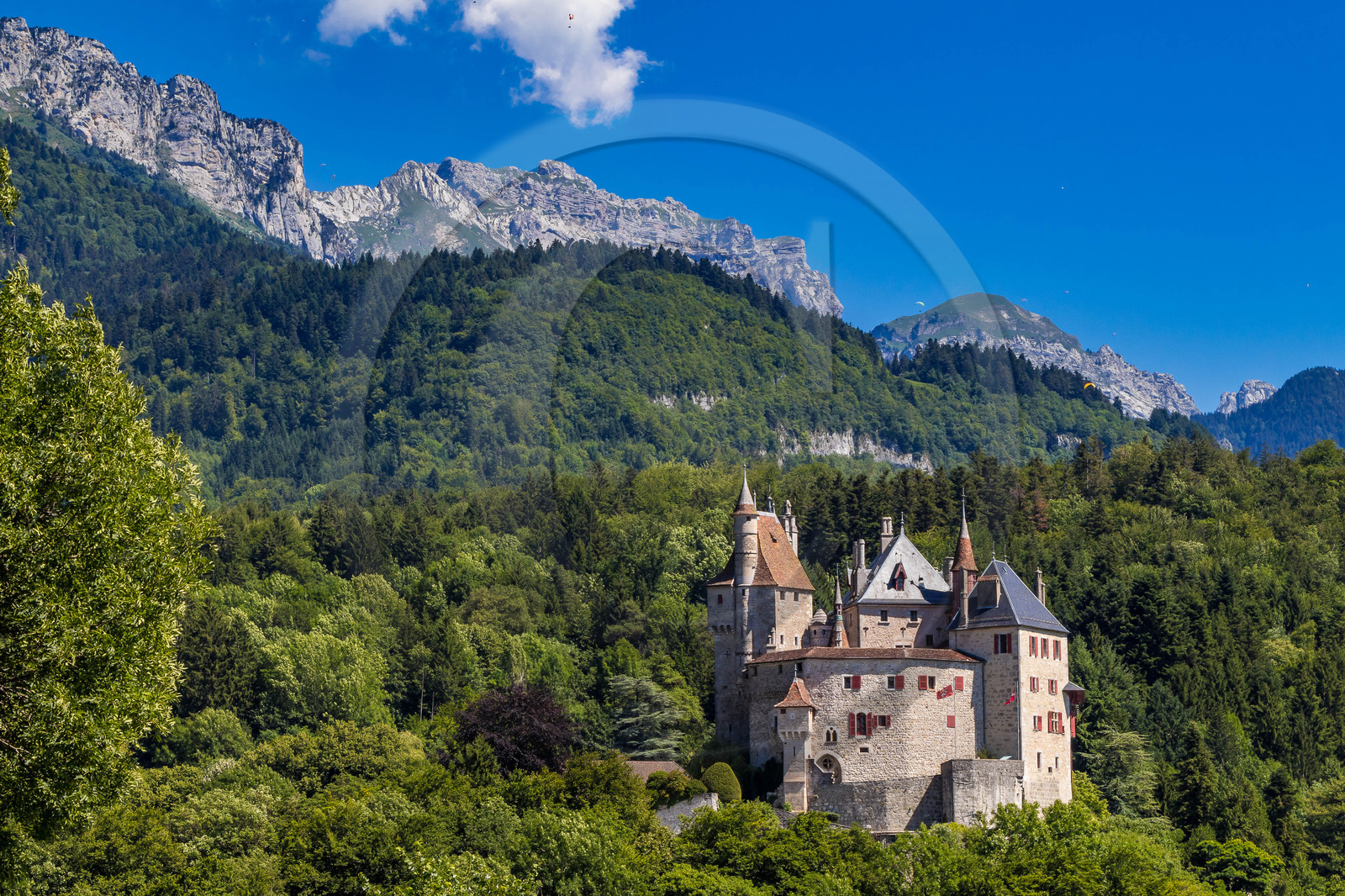 | Description | Haute-Savoie (74), Lac d'Annecy, Menthon-Saint-Bernard, Château de Menthon-Saint-Bernard et Les Dents de Lanfon |