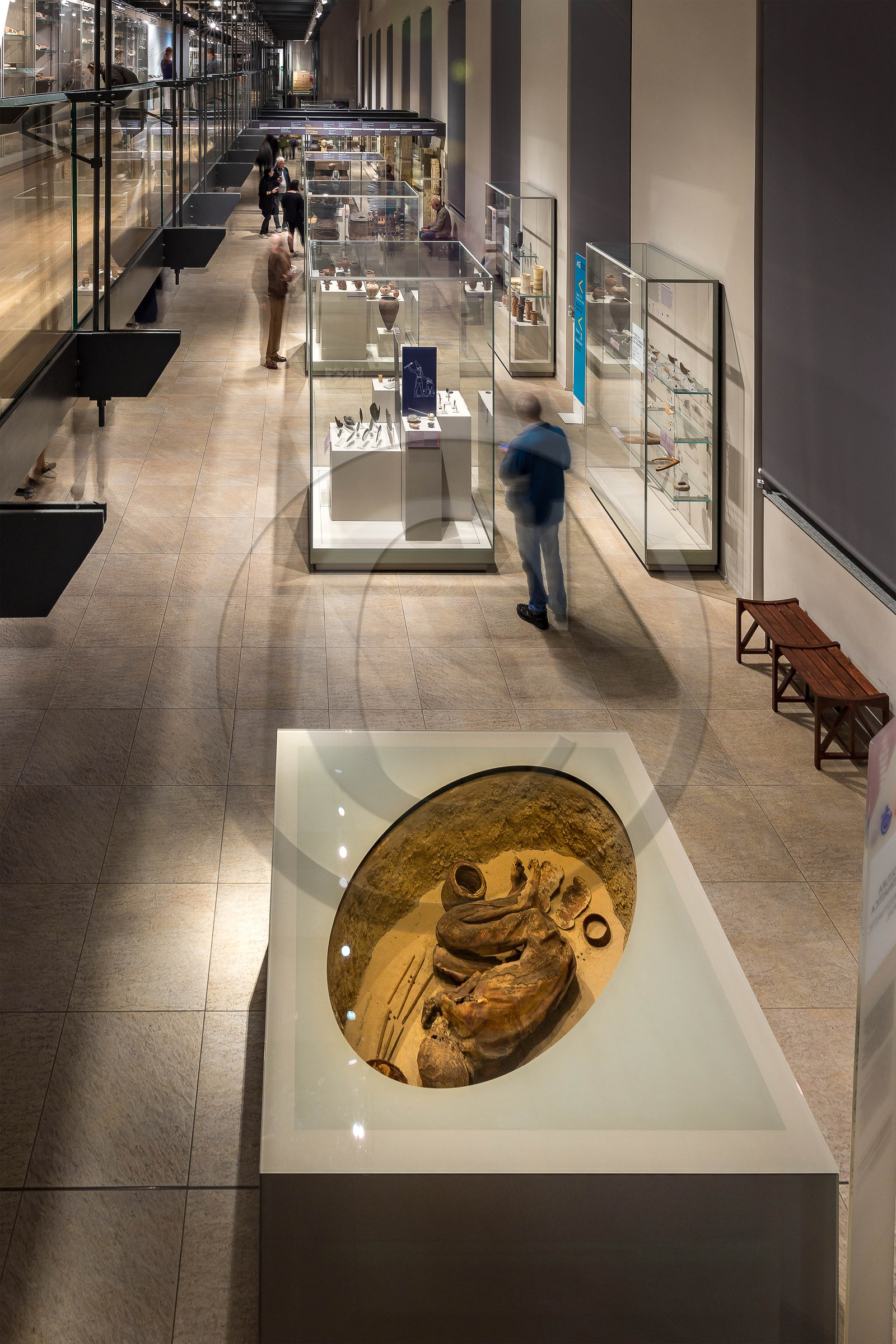 | Description | Italie, Piémont, Turin, Musée égyptologique de Turin, musée des antiquités égyptiennes (Fondazione museo delle antichità egizie di Torino), momie d'un homme en position fœtale, flèches funéraires, sandales, paniers, bols |