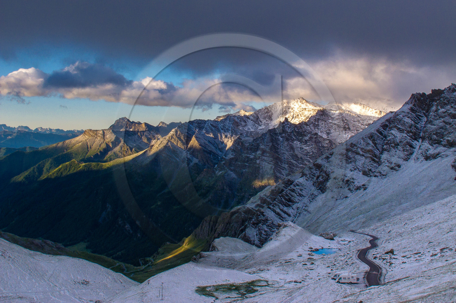 | Description | Hautes-Alpes (05), Parc naturel régional du Queyras, Col Agnel, 2 744 mètres d'altitude, col frontière entre l'Italie et la France, col emprunté par le Tour de France cycliste |