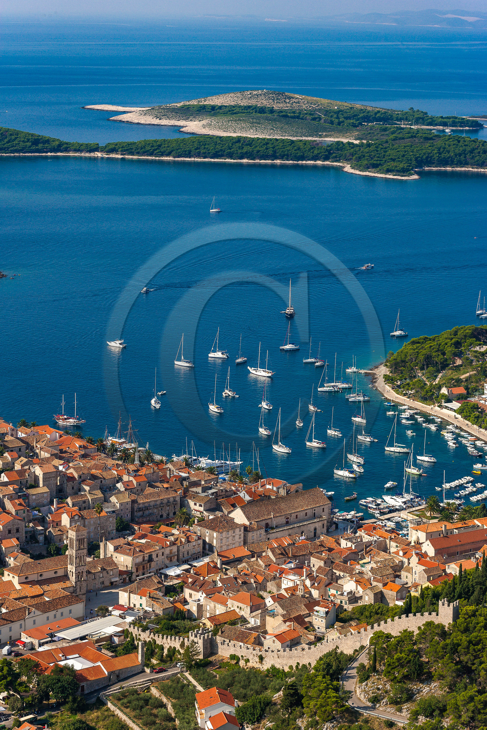 | Description | Croatie, Mer Adriatique, Ile de Hvar, Hvar, le port, les Iles Infernales |
