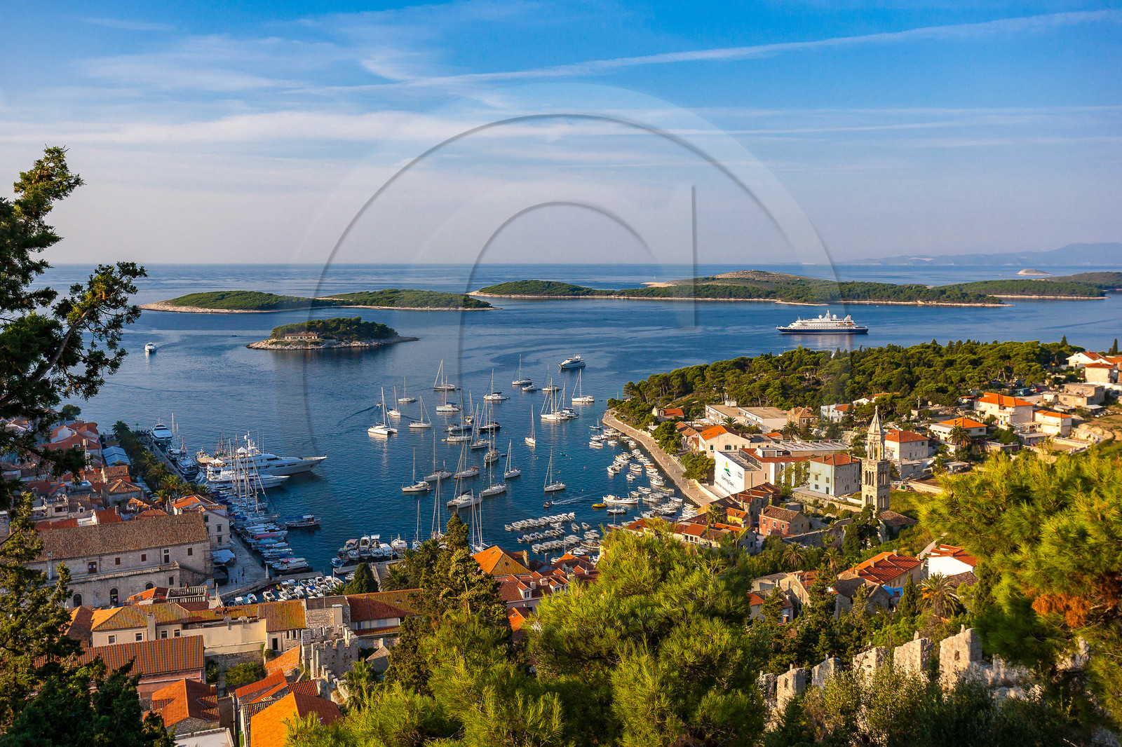 | Description | Croatie, Mer Adriatique, Ile de Hvar, Hvar, le port, les Iles Infernales |