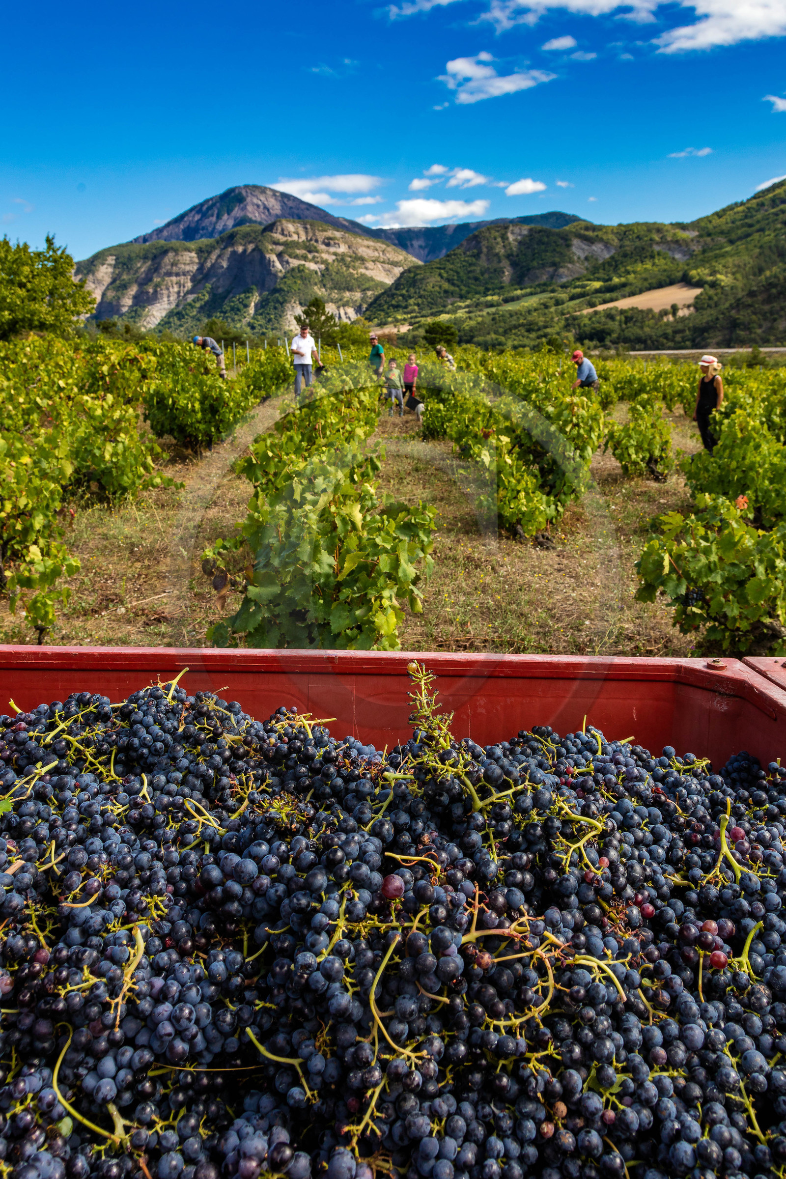 | Description | Hautes-Alpes (05), vallée de la Durance, Serre-Ponçon Val d'Avance, Théüs, Vignoble de Théüs, Domaine Allemand, les vendanges |