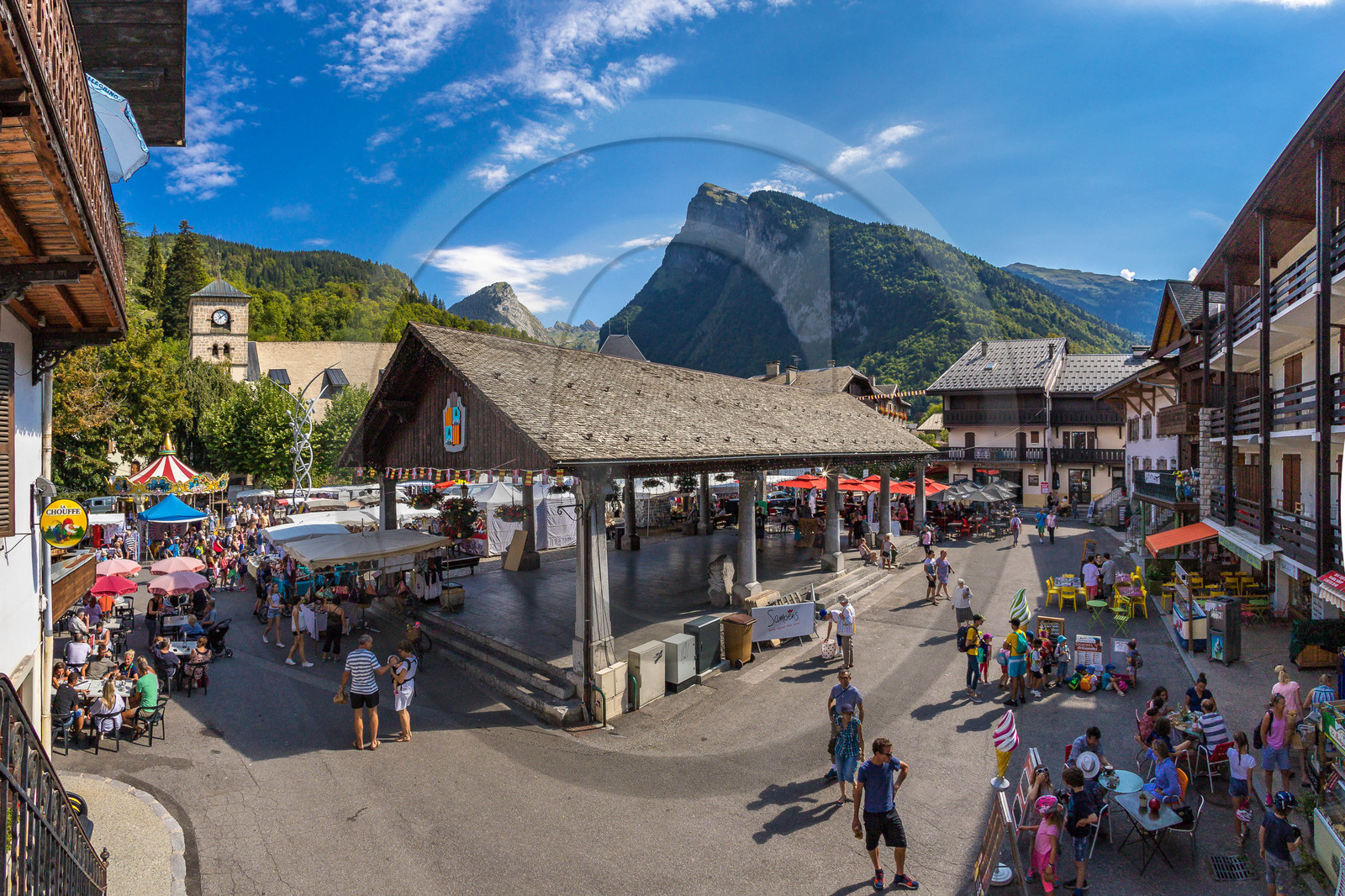 | Description | Haute-Savoie (74), Grand Massif Montagnes du Giffre, vallée du Giffre, Samoëns, le marché du centre ville |