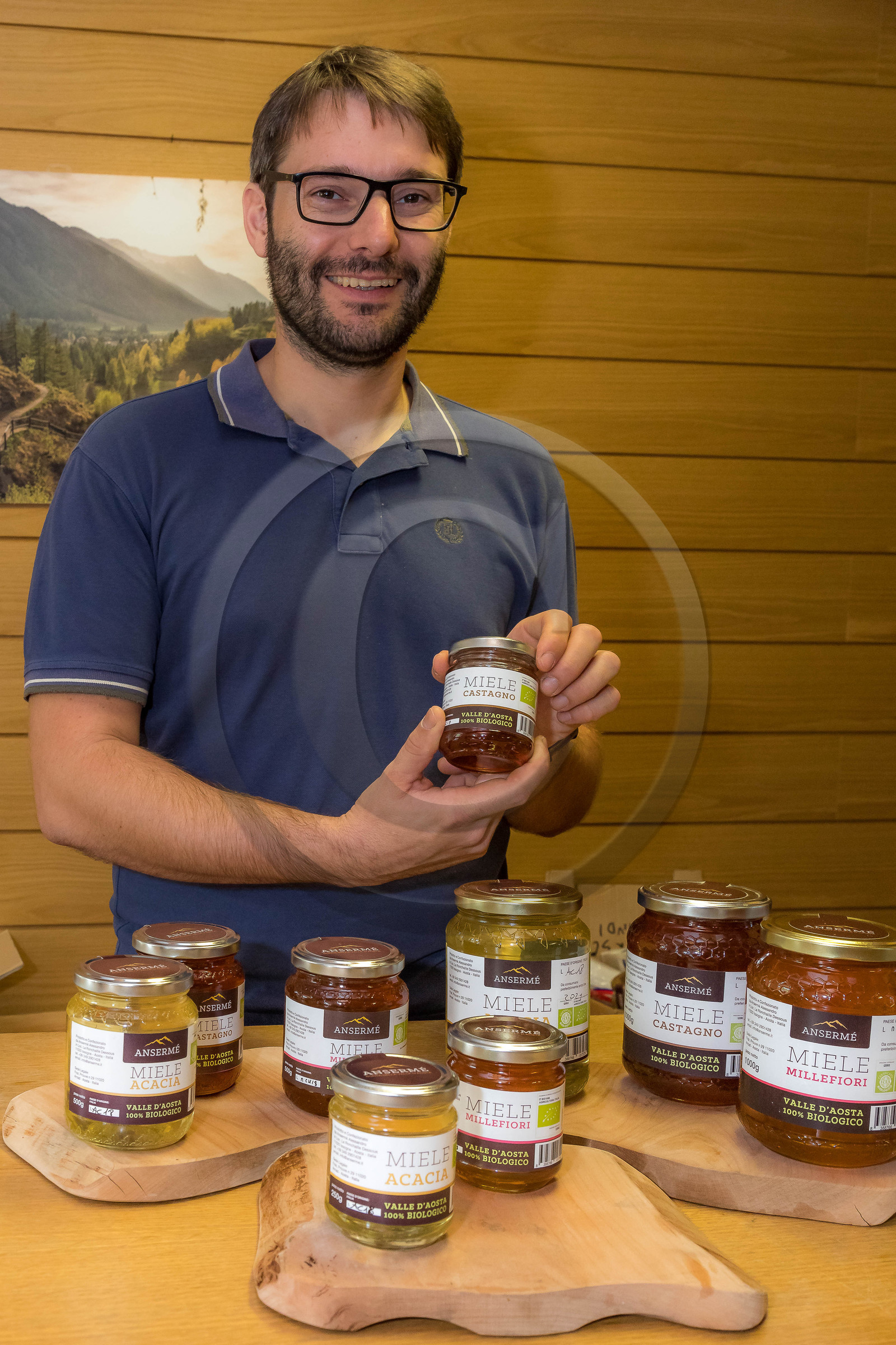 | Description | Italie, vallée d'Aoste, Introd, Maison Bruil, musée maison typique valdôtaine avec une société de promotion L'Atelier du goût, Alessandro Ansermè, apiculteur |