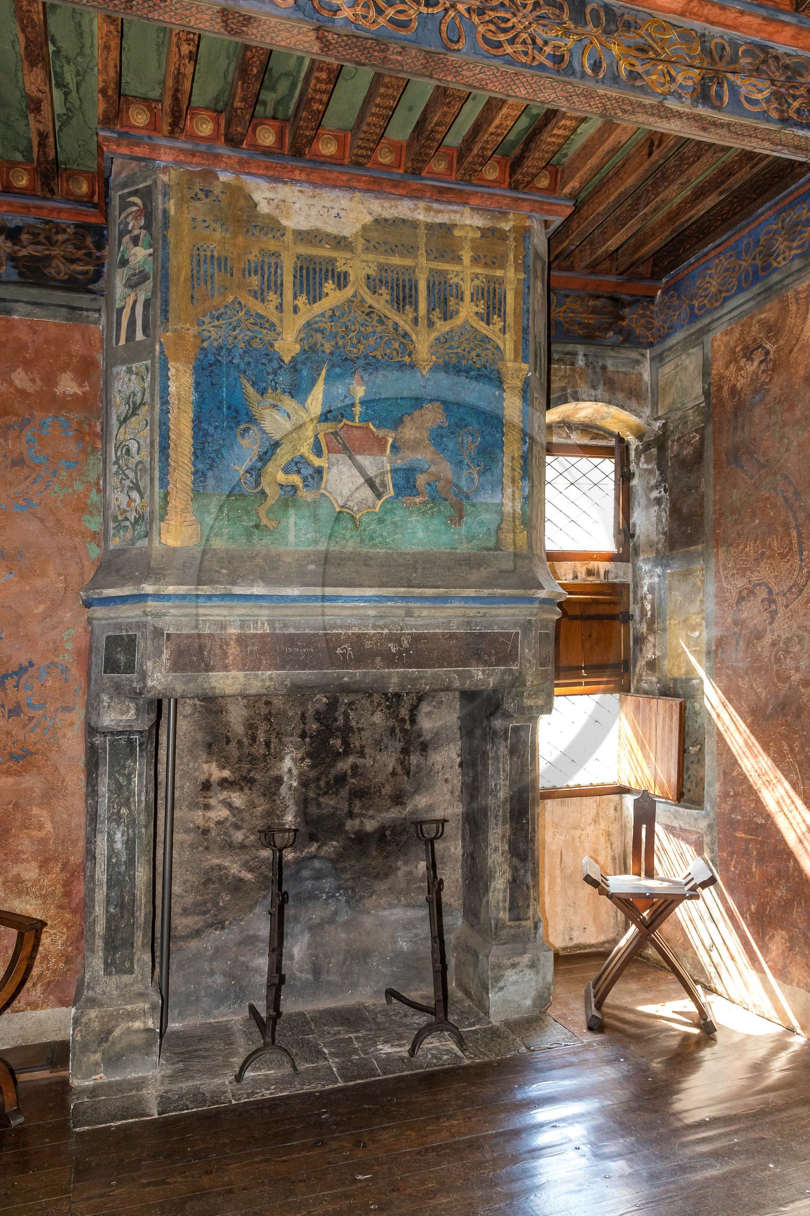 | Description | Italie, vallée d'Aoste, Issogne, Château d'Issogne, La salle du Roi de France, cheminée, ornée des écussons de la dynastie française des Valois |