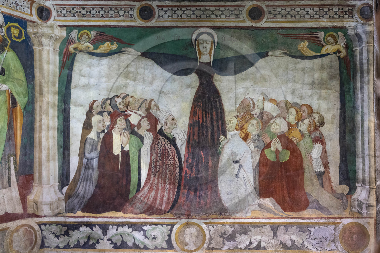 | Description | Italie, vallée d'Aoste, Aoste, Fénis, Château de Fénis, fresque de Notre-Dame-de-Pitié accueillant des fidèles sous son manteau |