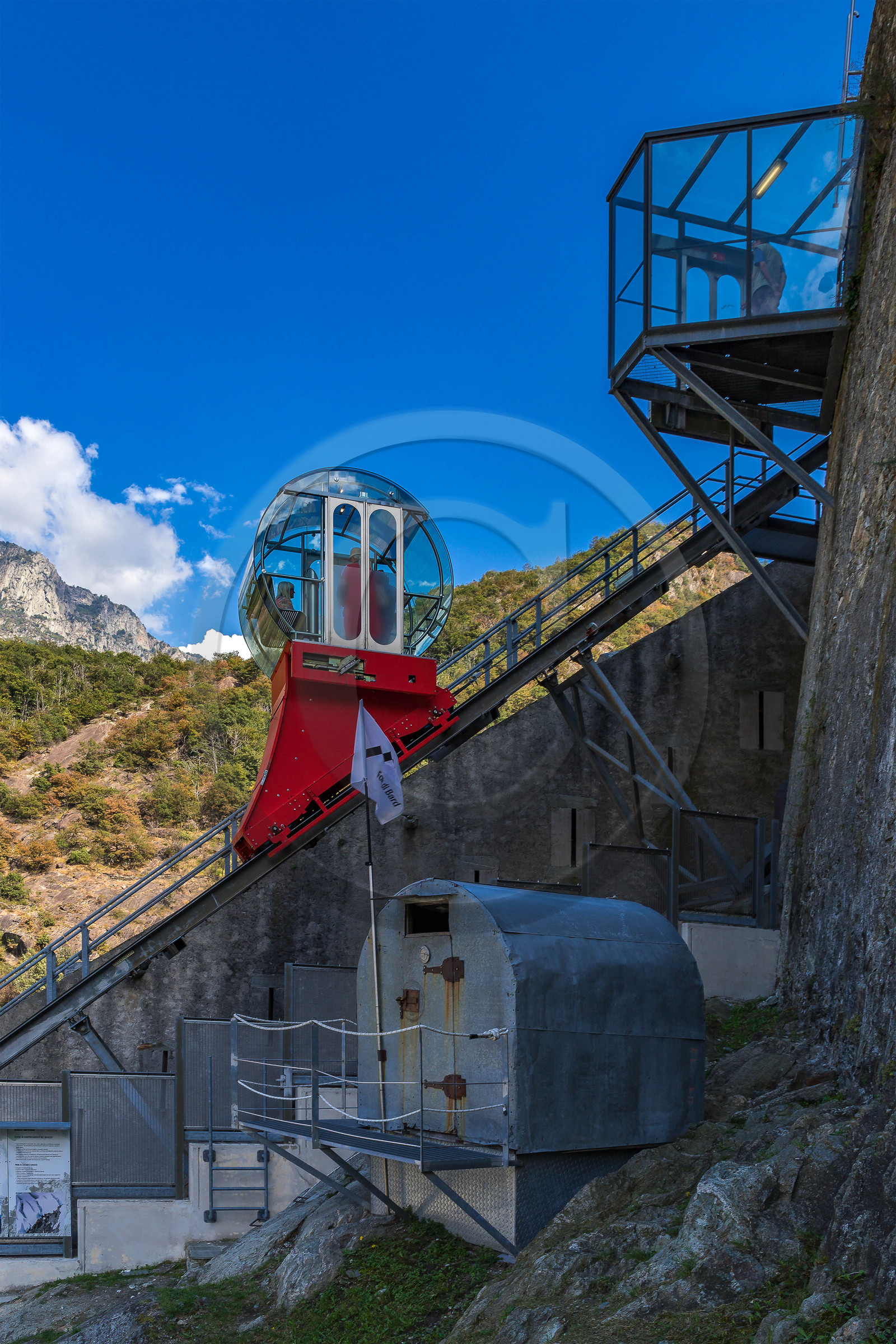 | Description | Italie, vallée d'Aoste, Bard, place forte Fort de Bard, ancien refuge-bivouac Giuseppe Lampugnani du Pic Eccles Mont-Blanc et l'ascenseur |