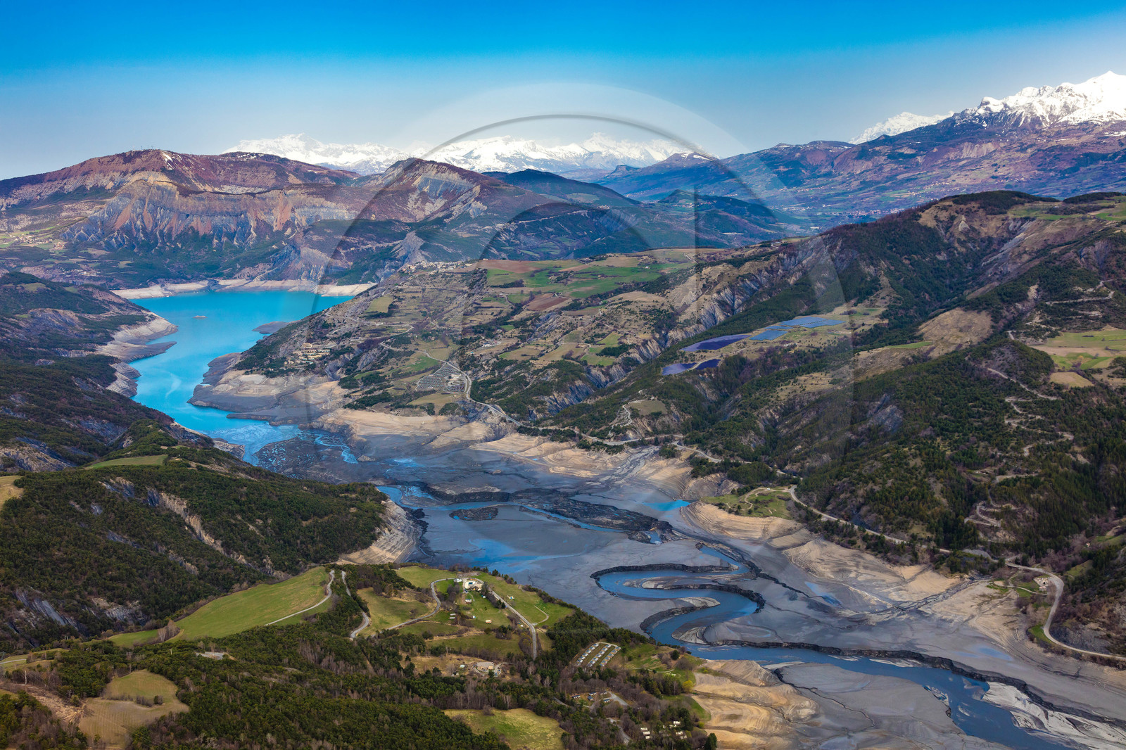 | Description | Hautes-Alpes (05), Pays de Serre-Ponçon, Barrage EDF, Lac de Serre-Ponçon, le niveau du lac est donné en mètres NGF 732 le 15 avril 2018, rivière l'Ubaye |