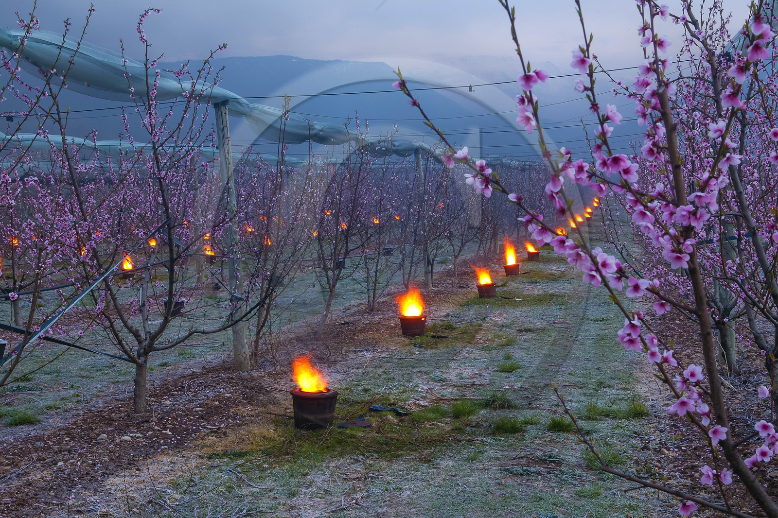 | Description | Hautes-Alpes (05), Vallée de la Durance, arboriculture, verger, chaufferettes à gazole pour la protection des fleurs du gel des pommiers et pêchers |